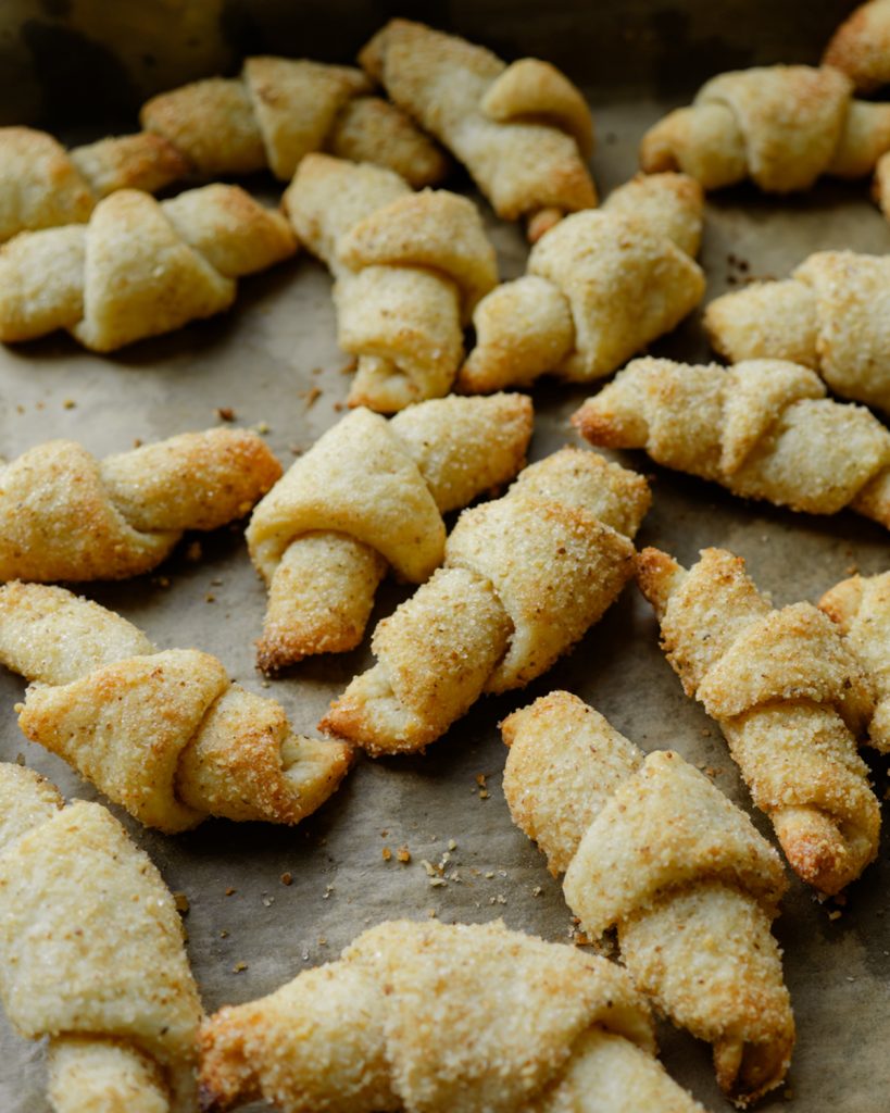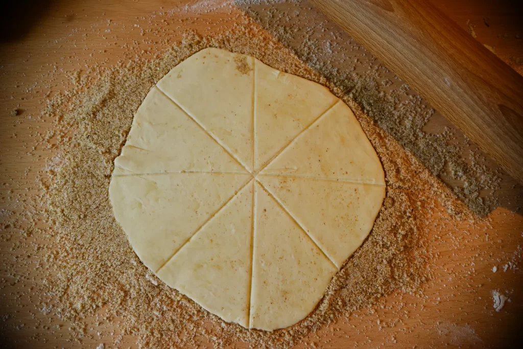 5. Zucker und Nüsse mischen und jeweils ein Viertel davon auf die Arbeitsfläche geben. Darauf den Teig rund ausrollen, in kleine Tortenstücke schneiden und von der breiten Seite zu Hörnchen aufrollen.