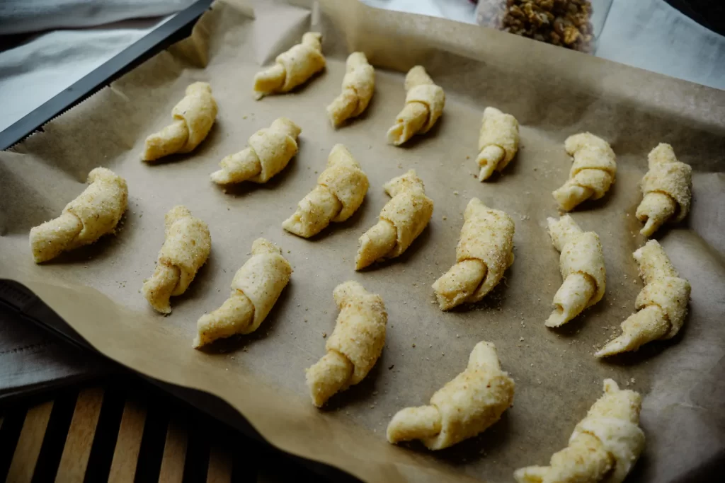 6.Auf ein mit Backpapier belegtes Blech legen und ca. 15 Minuten backen, bis sie leicht goldbraun sind (nicht zu dunkel werden lassen!).